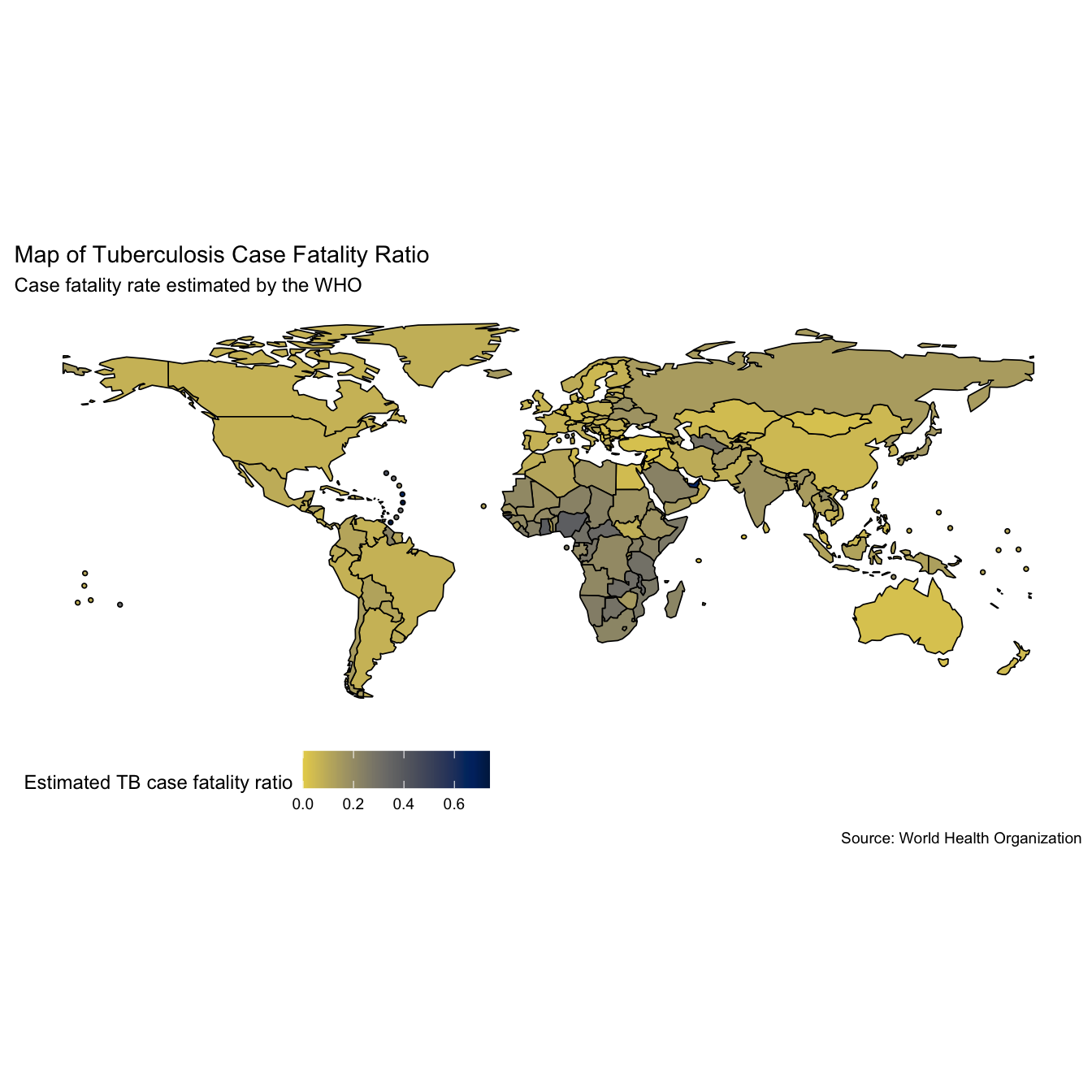 # Map TB case fatality ratio -2016 mp2 <- map_tb_burden(metric = "cfr", viridis_palette = "cividis", viridis_direction = -1) + labs(title = "Map of Tuberculosis Case Fatality Ratio", subtitle = "Case fatality rate estimated by the WHO") mp2