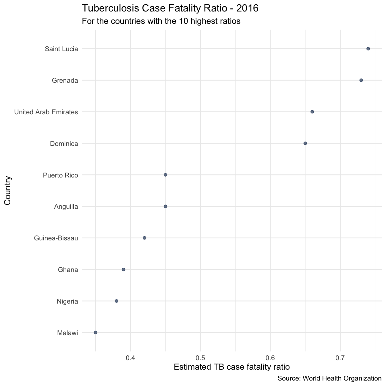 highest_case_fataltity_countries <- tb_burden %>% filter(year %in% max(year)) %>% arrange(desc(cfr)) %>% slice(1:10) %>% pull(country) highest_case_fataltity_countries #> [1] "Saint Lucia" "Grenada" "United Arab Emirates" #> [4] "Dominica" "Anguilla" "Puerto Rico" #> [7] "Guinea-Bissau" "Ghana" "Nigeria" #> [10] "Malawi"