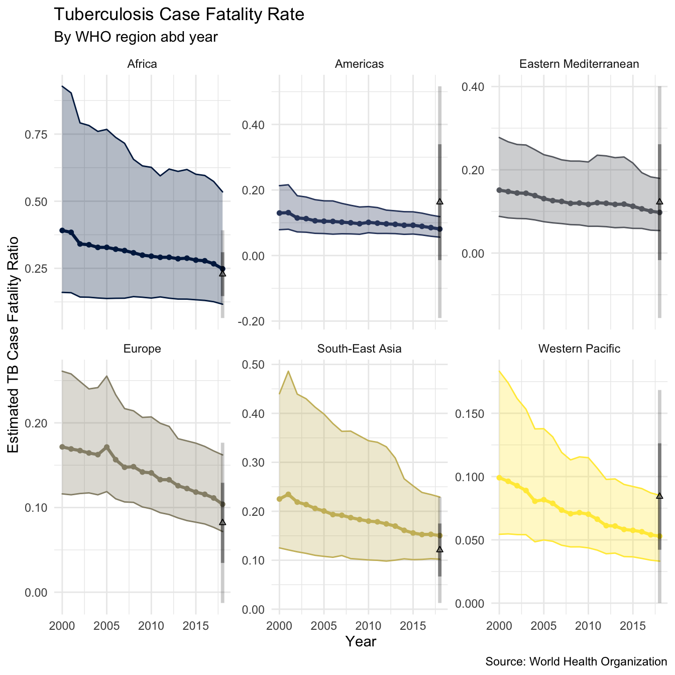 plot_region_case_fatality <- region_case_fatality %>% plot_rate_region(metric = "case_fat_rate", title = "Tuberculosis Case Fatality Rate", subtitle = "By WHO region abd year", scales = "free_y", y_lab = "Estimated TB Case Fatality Ratio") + labs(caption = "Case fatality ratio estimated by taking the ratio of TB mortality rates and TB incidence rates each year in all years. For the most recent year the mean regional case fatality ratio estimated by the WHO is also shown (along with one and two standard deviations)") + geom_point(data = region_case_fat, aes(y = mean, x = year, fill = g_whoregion), shape = 2, size = 1.3, col = "black") + geom_linerange(data = region_case_fat, aes(ymin = ll, ymax = hh, y = NULL), alpha = 0.4, size = 1.2, col = "black") + geom_linerange(data = region_case_fat, aes(ymin = lll, ymax = hhh, y = NULL), alpha = 0.2, size = 1.2, col = "black") plot_region_case_fatality + labs(caption = "Source: World Health Organization")