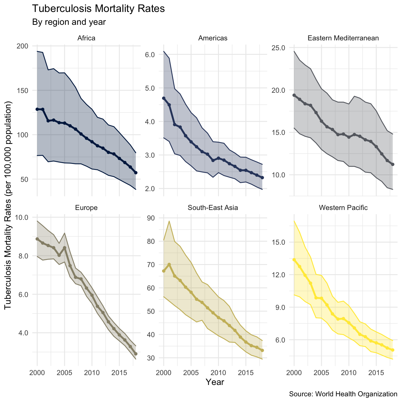 plot_mort_region <- tb_burden %>% rate_region(metric = "e_mort_num") %>% plot_rate_region(metric = "e_mort_num", title = "Tuberculosis Mortality Rates", subtitle = "By region and year", scales = "free_y", y_lab = "Tuberculosis Mortality Rates (per 100,000 population)") plot_mort_region + labs(caption = "Source: World Health Organization")