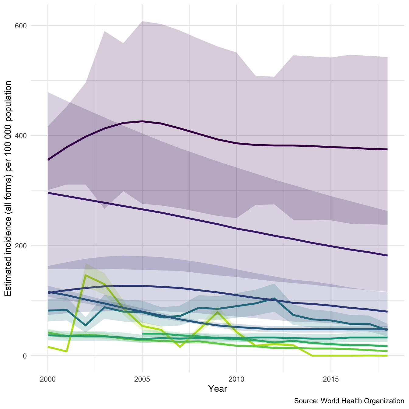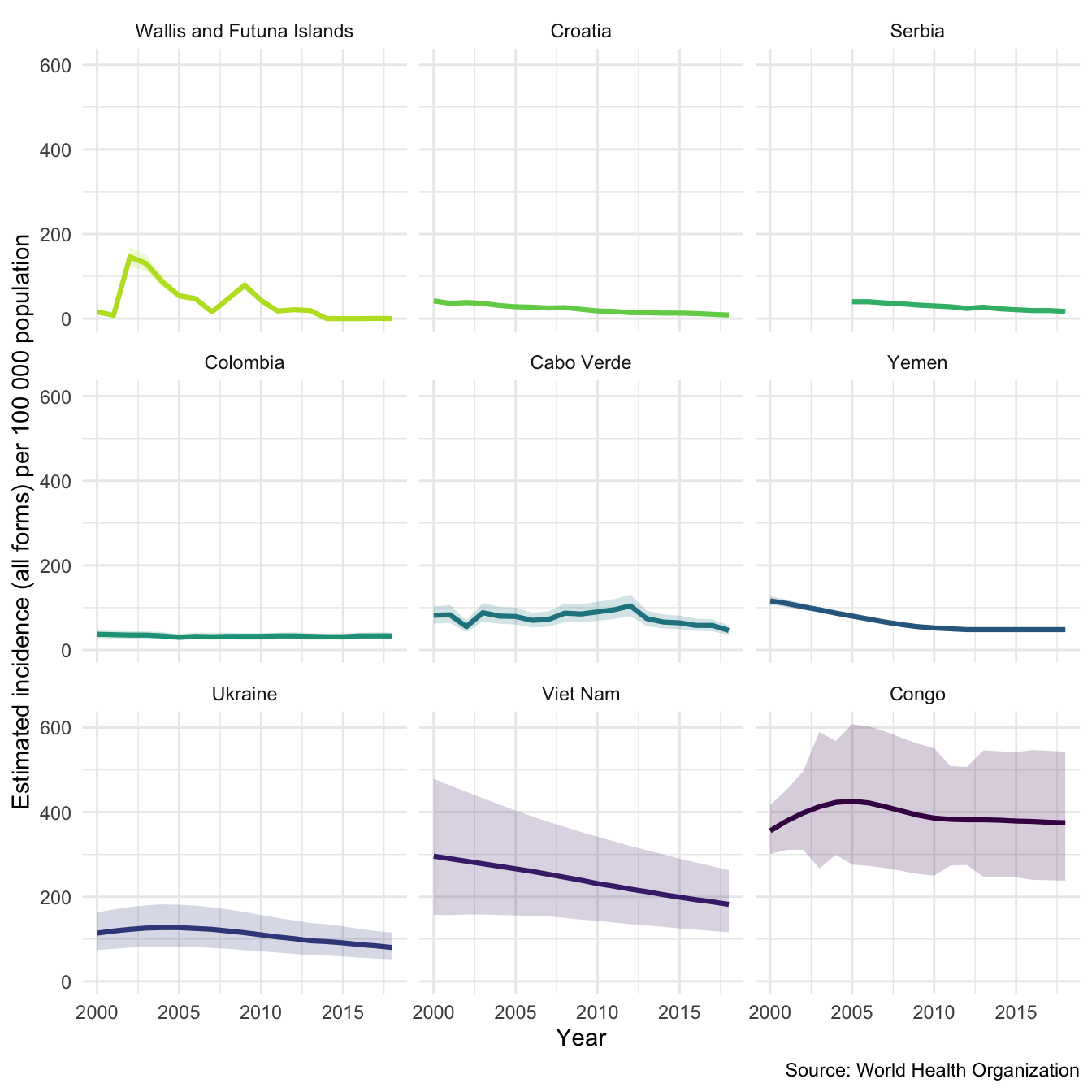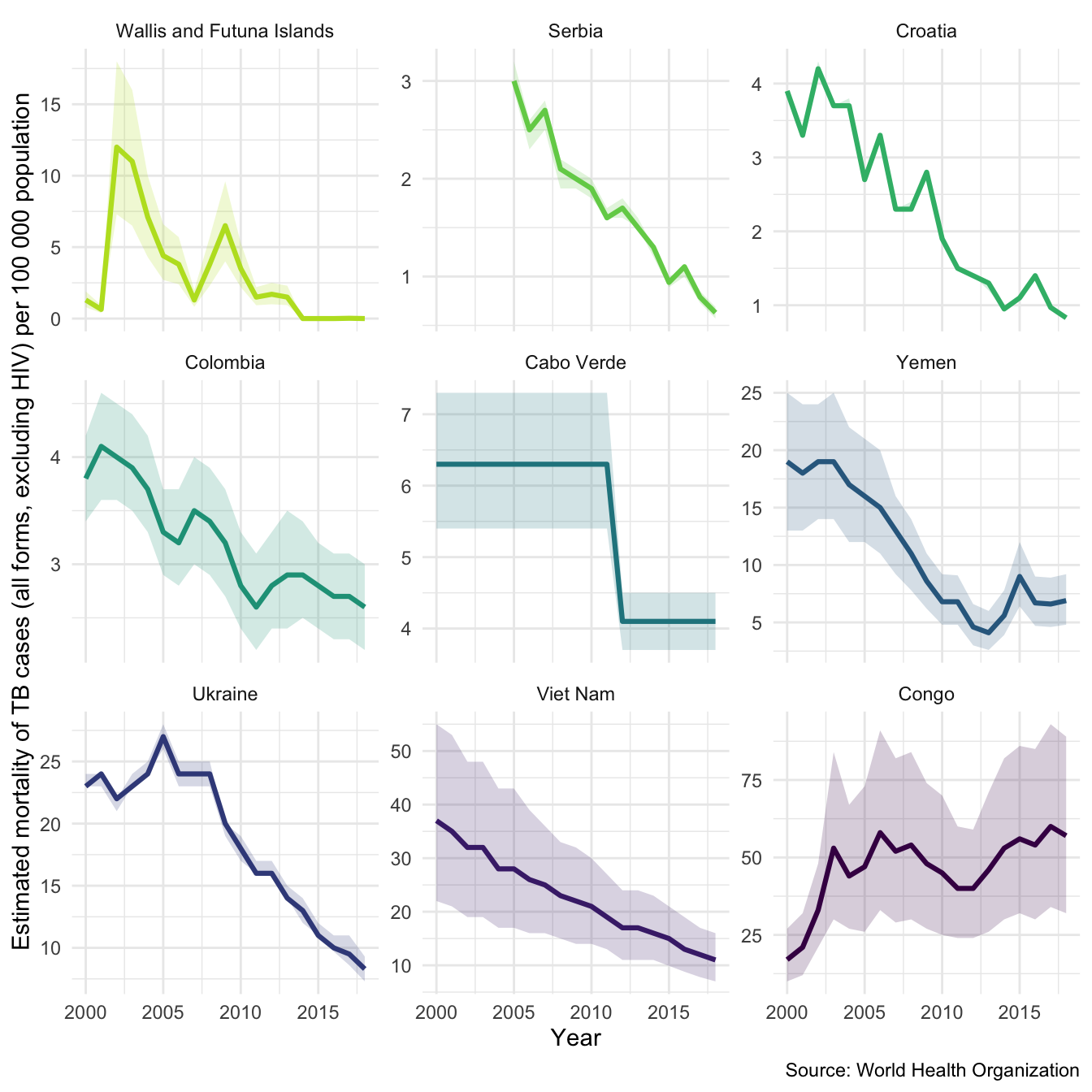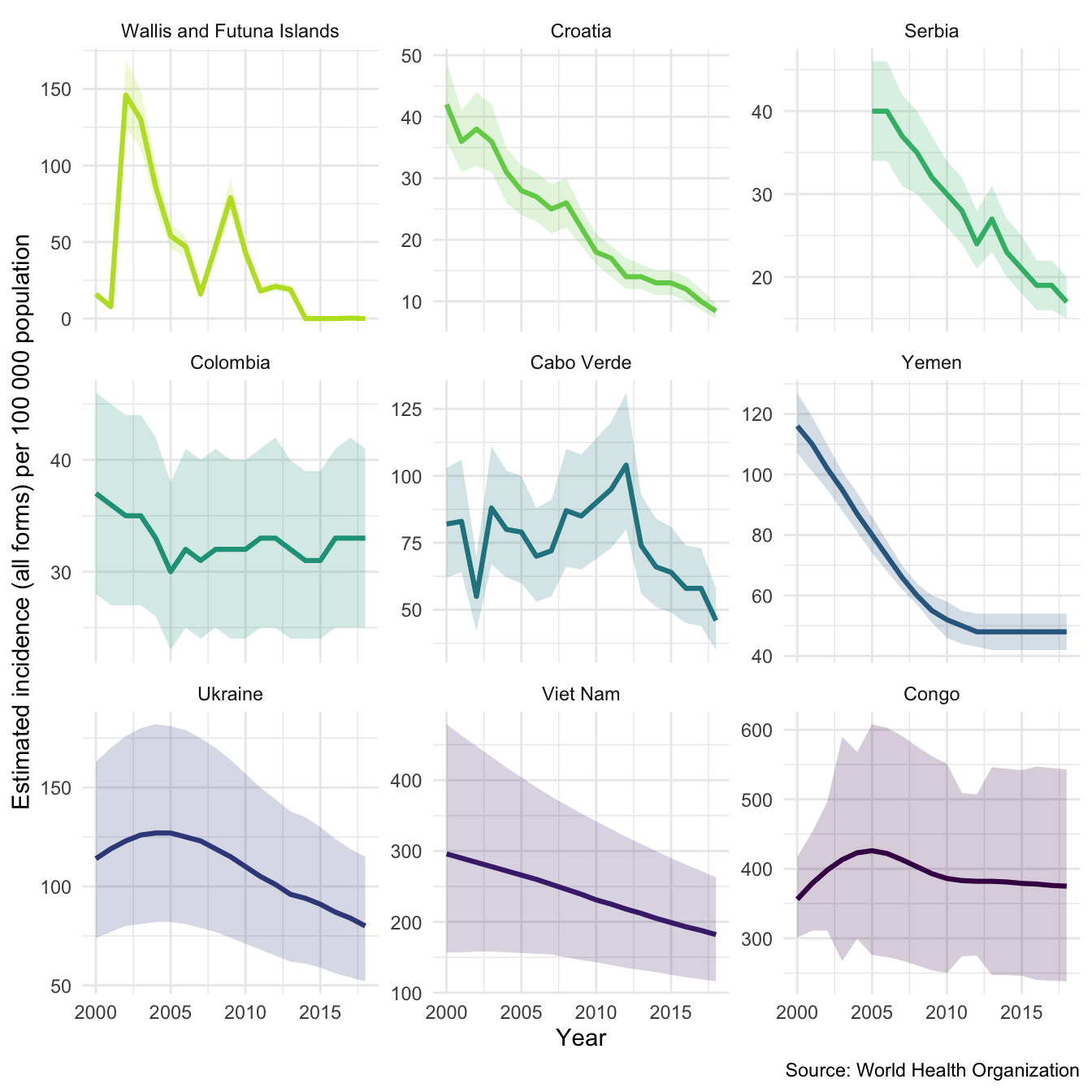 ## Take a random sample of countries sample_countries <- sample(unique(tb_burden$country), 9) plot_tb_burden(tb_burden, metric = "e_inc_100k", countries = sample_countries)