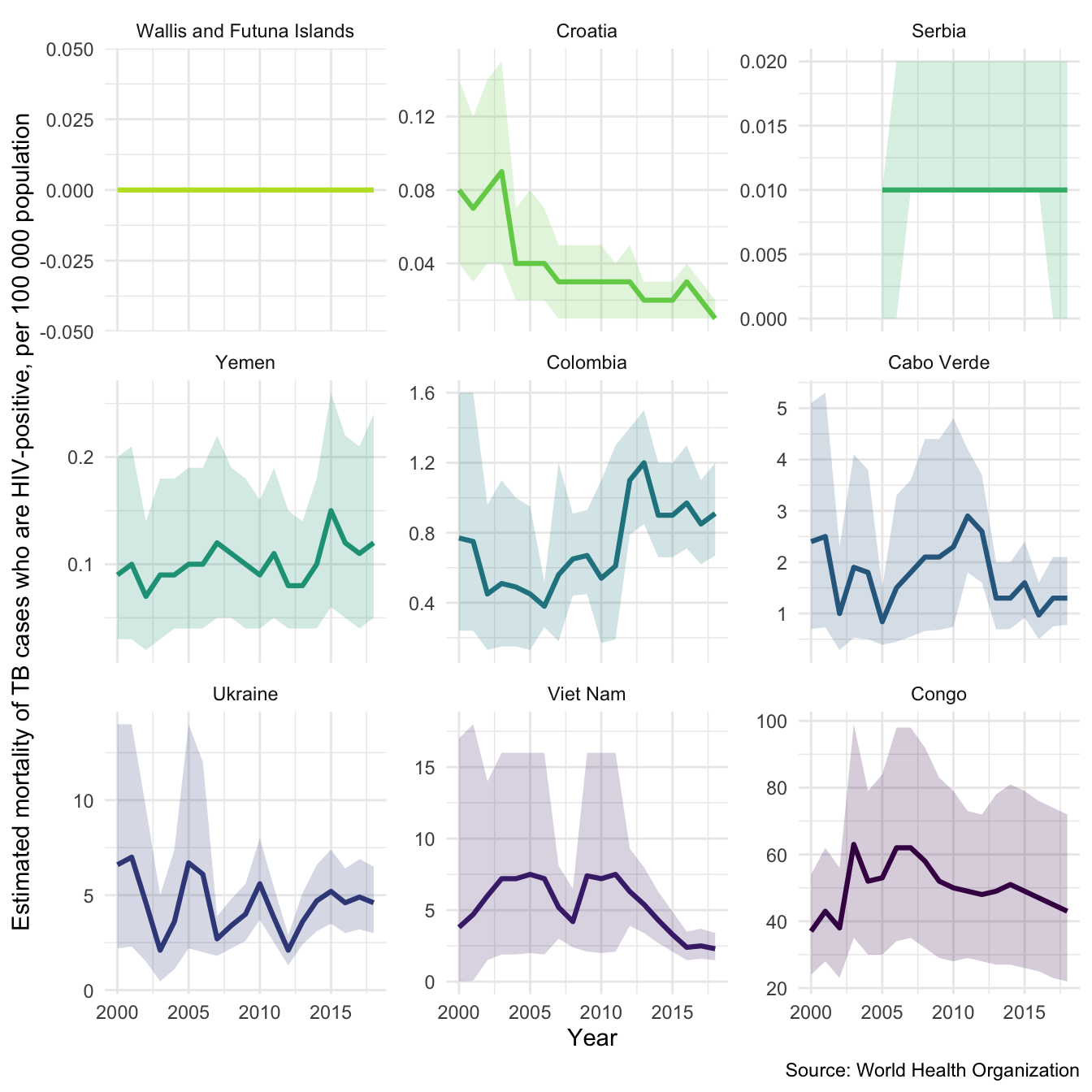 plot_tb_burden(metric = "e_mort_tbhiv_100k", countries = sample_countries, facet = "country", scales = "free_y")