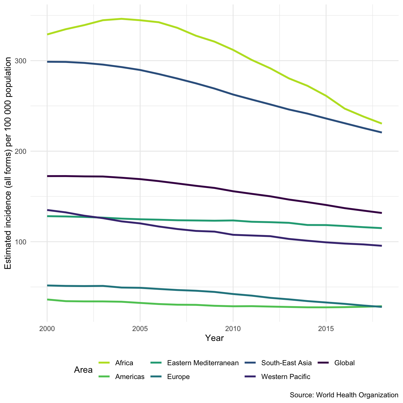 We could also get a quick overview of TB in a given group of countries in comparison to regional and global trends by looking at the most recent data using summarise_metric. This is used extensively in the supplied TB report (render_tb_report) to provide summary statistics.