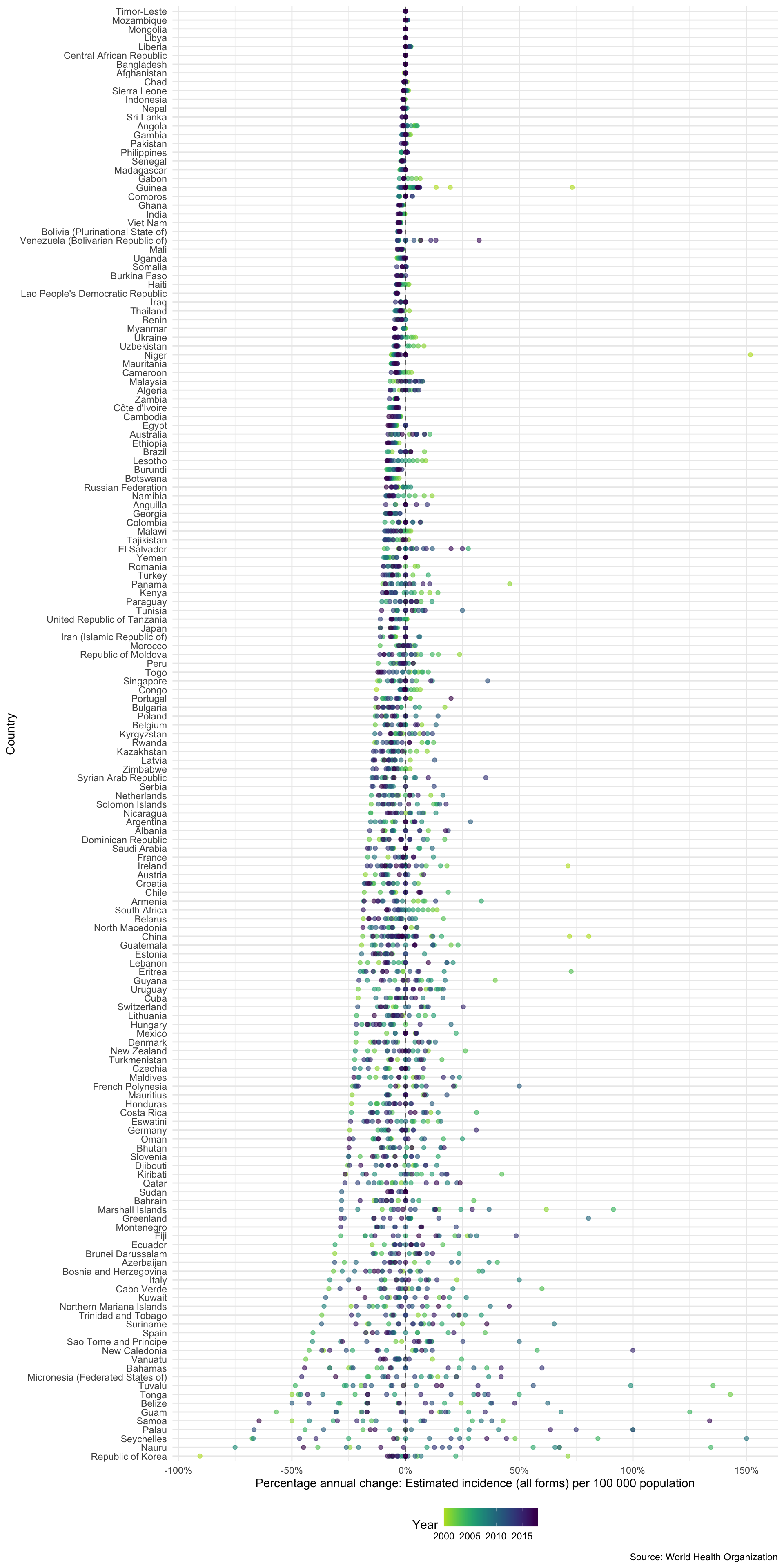 To showcase how quickly we can go from no data to plotting informative graphs we quickly explore incidence rates for all countries in the WHO data.