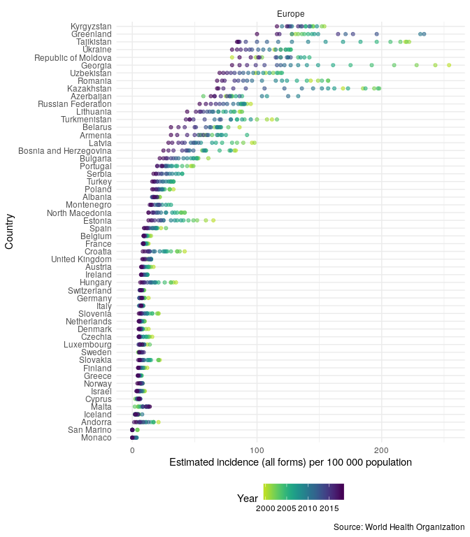 The WHO makes use of several standardised plot themes and colour palettes. getTBinR implements these so that the package can be easily used internally at the WHO or by those collaborating with the WHO.