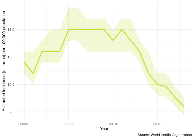 #> # … with 123 more rowsHere e_inc_num is used rather than e_inc_100k as incidence rates are being estimated based on notified cases. This allows country level rates to be compared to regional (using compare_to_region = TRUE) and global (using compare_to_world = TRUE) rates.