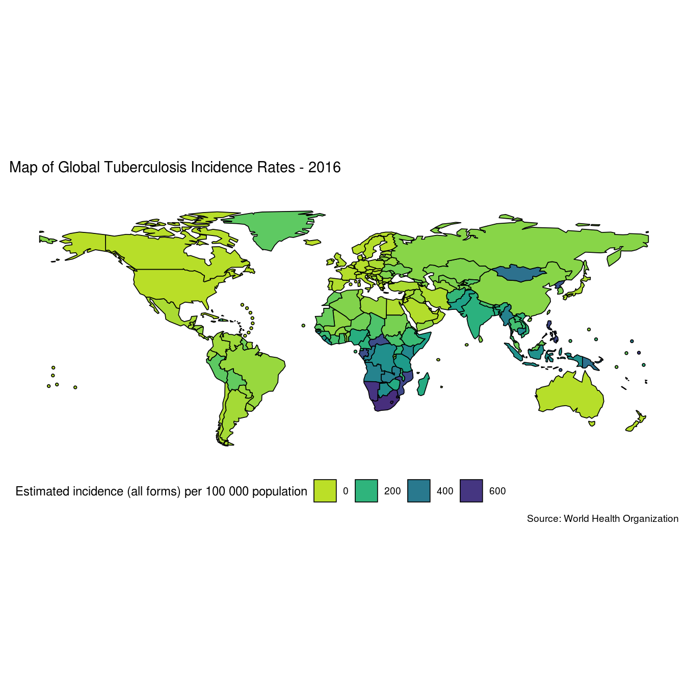 labs(title = "Map of Global Tuberculosis Incidence Rates - 2016",
