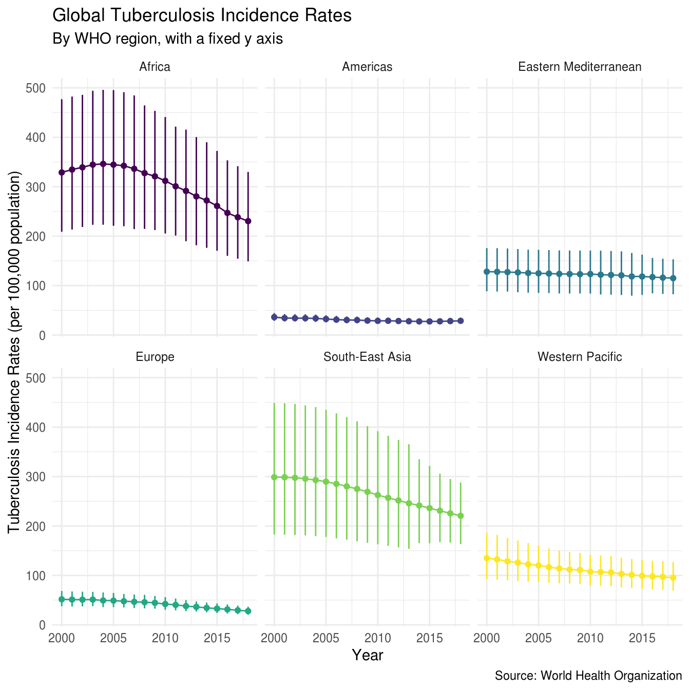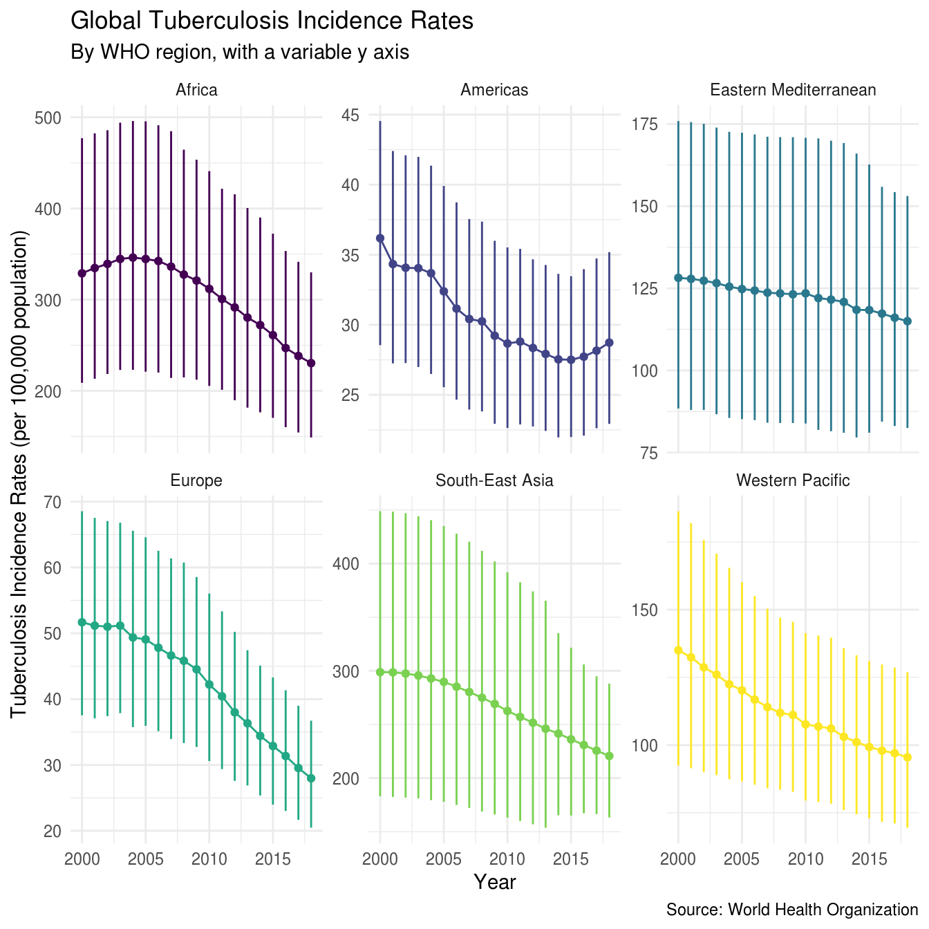 We see that incidence rates are much higher in Africa, and in Asia, than in other regions, and that incidence rates in the Americas and Europe are the lowest. This chart has a fixed y axis which makes it hard to see trends over time within regions, if we repeat it with a free y axis the trends over time become more apparent,