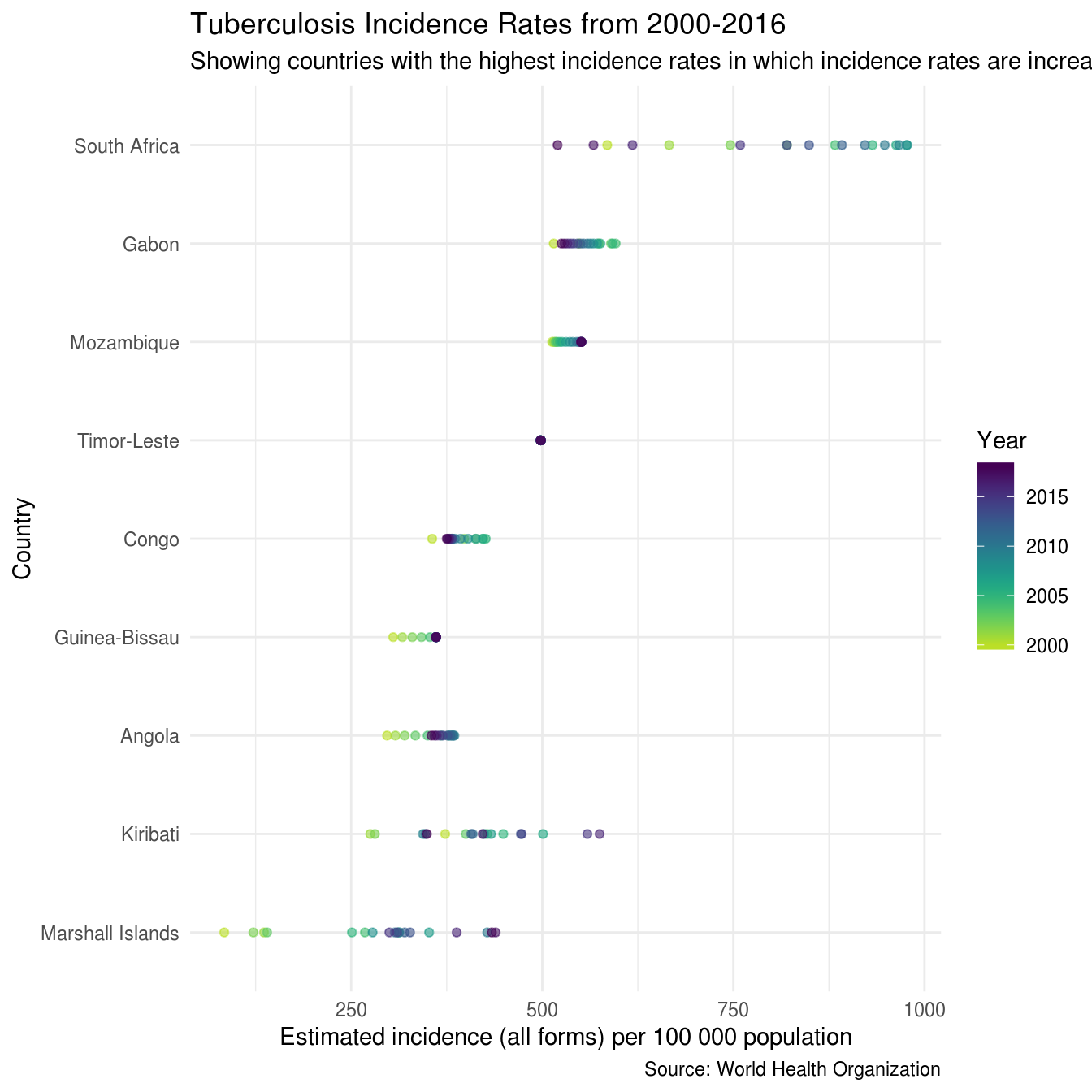 labs(title = "Tuberculosis Incidence Rates from 2000-2016",